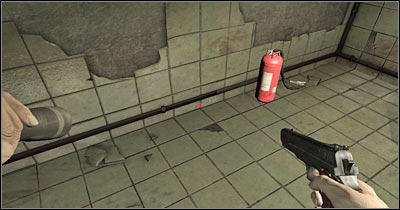 Try going to the next room. Notice that you won't be able to pass through until you've dealt with the fire. Go back to the public toilet and find a small room which is located to the right of the entrance. You should be able to find a fire extinguisher here (screen). Go back to the flames and use the extinguisher. You may proceed to the next section.