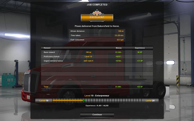 By completing orders you earn money and gain experience points (EXP). You gain 1 EXP for each kilometer with a cargo. Your skills allow for gaining bonuses apart from money and EXP. You may get some extra payment. Notice, that the bonus payment corresponds with your driver's level (second row). Below you can check other bonuses depending on the order type (e.g. dangerous substances, cargo of high value, etc.). When you gain enough EXP, your level will rise.