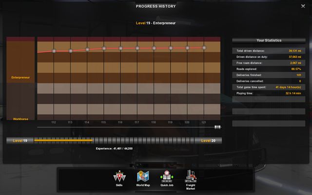 The main panel available in the player's profile allows you to check the "progress history" where a diagram displays the number of EXP points gained for various orders, total number of kilometers and other statistic data.