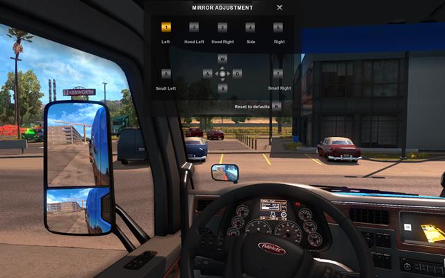 The main panel of "my truck" section has the "cabin modification" option. Use it to change the mirror settings. You can change the position (use [W], [S], [A], [D] buttons) of each mirror (buttons [1], [2], [3], [4], [5], [6], [7]) to have a better field of view.