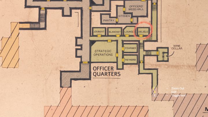 Look on the map to see that your main objective is the Delisle's room. You'll find it in Officers Quarters. The door hanger with name written on it will hang vertically, and there should be a hole in the middle of the door.