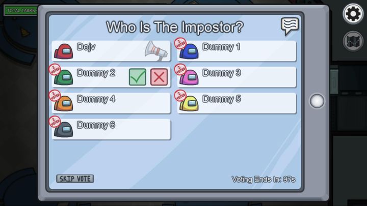 Emergency meeting is the gathering of all players in one place. At this point, players vote for the player they think is the impostor. There is an unwritten agreement that the person who reported the body or pressed the red button speaks first. This person has a megaphone on the right side. He tells his version of events, convincing others what really happened. Other players can either write in a chat or engage in a discussion through the Discord voice messaging service. Keep in mind that the meeting time is limited - you can view how much time is left through the timer that appears in the bottom right corner. When the discussion is over and you want to vote for a particular player, click on their nickname, and approve the choice by clicking on the green box. You can also press Skip Vote to skip the vote.