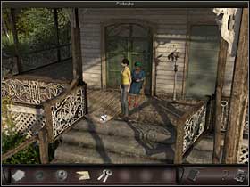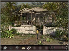 The main road through the village leads to the shaman's house (cursor at the end of the street). Upon stepping onto the terrace Nicole meets Ines who makes the decisions about madame's visits and won't let the agent through. Luckily, the heat is overwhelming and Nicole hopes that the broken fan behind Ines will produce an opportunity to get in without waiting.