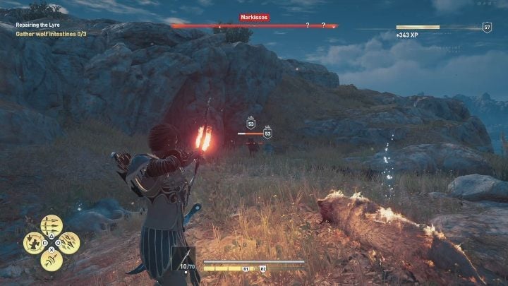 Your mission is to escort Praxilla to the given location. There, you'll learn the items you need to pick-up to fix the lyre. First, you need to bring 3 wolf intestines.