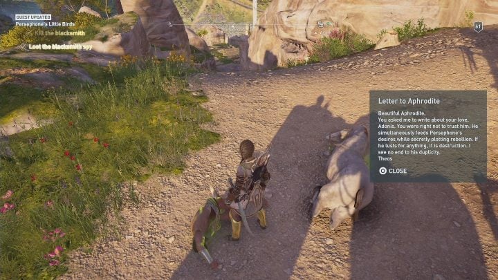 During the conversation with Adonis, you must choose whom you will kill - the blacksmith or the messenger. Depending on your choice, you will have to hunt down one of the men and kill him. Afterwards, you must come back to Adonis, and then the mission will end.
