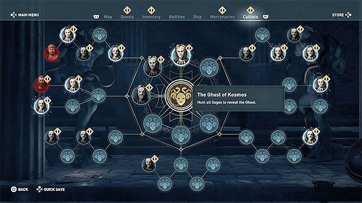 - Comment: Your first encounter with the Cultists of Kosmoswill be on Phokis when you are exploring the location beneath the temple of Apollo as a part of the main storyline. It will add a new tab to the pause menu (screenshot above). From now on you can identify and locate other cultists from the tree. More info about this is available in Kosmos Cultists chapter of this guide.