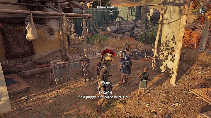 You get a Chance to talk to Lykaon after you pay a visit to the secret headquarters of the secret cult beneath the temple of Apollo. This is when the marker person that gives you a side quest appears on the map. This marker is located in Chora of Delphi near the Pythia Oracle's house. This place is located in the central part of Phokis, west from the temple of Apollo.
