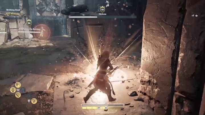After you kill all minor enemies, Medusa will be stunned and vulnerable for a moment. Lean out and do some damage to her. Be careful not to stand long before the enemy - Medusa will try to turn you into a stone, so hide behind the columns if necessary.