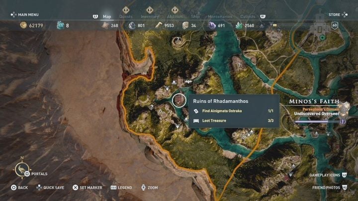 - In Minos's Faith, you'll find two enemy bases - Mausoleum of the Kingless Queen and Ruins of Rhadamanthos.