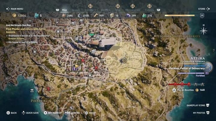 After completing the missions in Keos, Korynth and Agrolida, it's time to go back to Athens. Go and talk to Aspasia. On your way, you will meet Phoibe, who will run god knows where. Go and talk to Aspasia to learn of the unfortunate events that took place in Attika. Go to the floor and talk to Pericles.