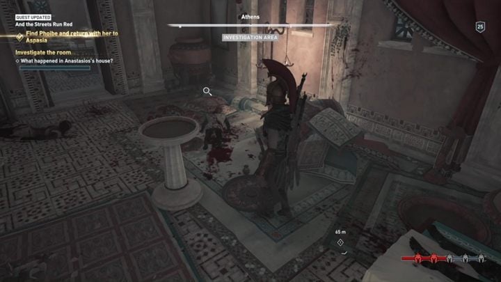 Find Phoibe, who is irresponsibly running around the city. Go east of the theatre and you will shortly reach a room full of bodies and blood.