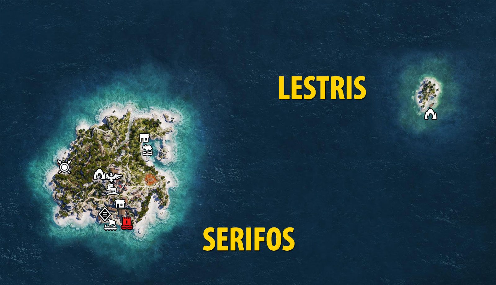 This page of our guide for Assassin's Creed Odyssey contains the map for Seriphos and Lestris islands which are part of the Pirate Islands archipelago. Locations that can be visited are marked on the map. Among them you can find numerous activities and places such as vantage points, enemy camps, tombs, animal nests, villages and ports.