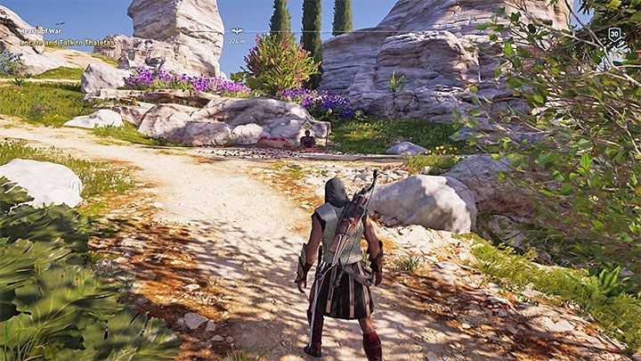 Thaletas will invite you to meet him on the beach - this is a marked section of the Delos beach. When you get there, you'll find an empty camp, but you can start following the petals of flowers scattered on the ground. They will lead the hero to the place where Thaletas is waiting.