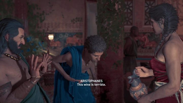 You will find Sophokles in one of the rooms. He will ask you to take the wine and ply Euripides with it. Agree - talk to the woman next to you and take the wine. Next, go to the main hall and encourage your target to keep drinking wine. Return to Sophokles and tell him about the incident to complete this quest and earn 7500 XP.