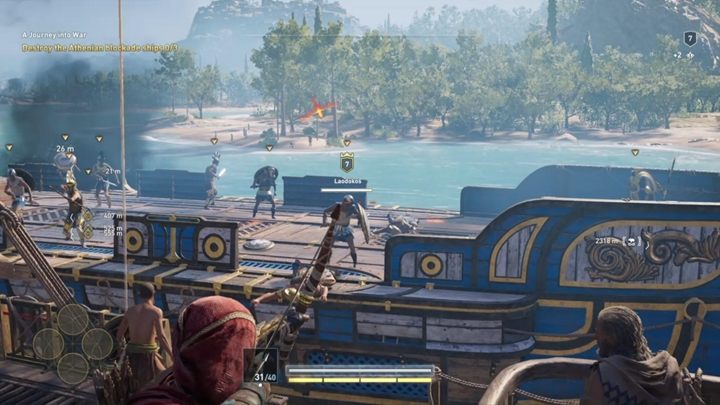 Reach Megaris. Notice three Athenian ships near the land. Destroy them - focus on weaker ships. Approach them from a side and ram into them. You can board larger ships when their "health" goes down to zero. Defeat their crews to collect valuable items/resources.
