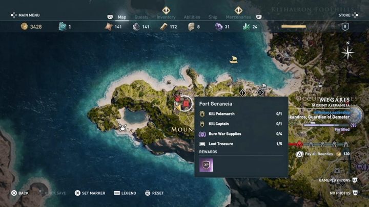Visit Port of Nisaia. Find four supply chests and burn them. This quest is much more difficult. Start by sending the eagle to locate all the chests and soldiers. Defeat enemies in the places with chests and then burn them with a torch. Reward: 2,100 XP.