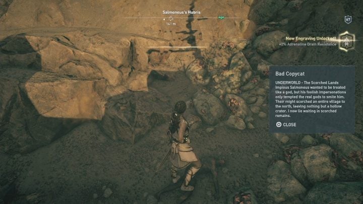 How to solve: The solution to the riddle is in the body of the burned man, next to Salmoneus's Hubris. The corpse lies next to a small pond.
