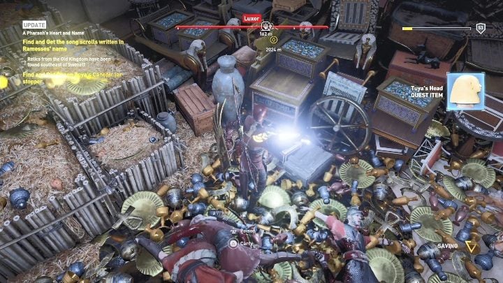 At the beginning of the missions you need to find the treasure from the tomb, located in Luxor. There's a warehouse full of gold. You need to kill all of the enemies located in the area. Once done, pick up Tuya's head.