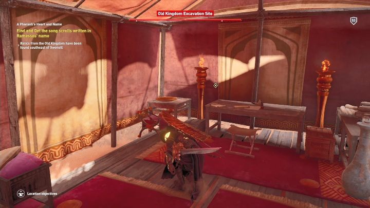 Once you've collected one of the artifacts, you must head to the enemy encampment - Old Kingdom Excavation Site. There, in the tent, on the table, you will find a papyrus. Pick it up to complete the mission.