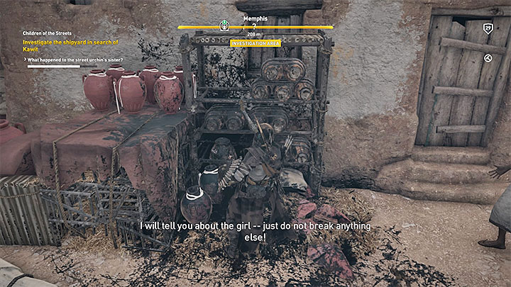 Your first objective is to obtain a fertility talisman. Send Senu to scout Memphis and located a shop that sells talismans. The eagle will find a passage to undergrounds. Go to a chamber in the basement. There, you can meet a merchant. Talk to her. After that you should examine the whole room. Check the big board, jugs and scrolls. Lastly, you should check out the big object hidden behind cloth (presented in the picture). You can move it. This unlocks a passage to a hidden room in which you can find the fertility talisman. Be careful because Bayek will be attacked by a few enemies.