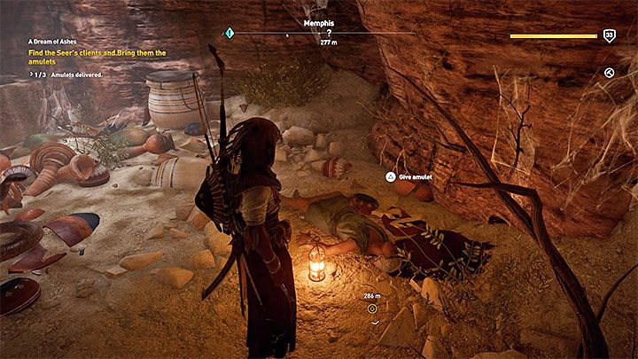 The second client is in the south-east part of Memphis. Senu needs to find a medium sized hole that will allow you to jump down to the underground. Use the torch to light up the area and watch out for cobras. You must also get rid of enemies in one of the bigger chambers. Don't jump into an underground lake when you reach it. Instead, go along the narrow stone ledge to the left corridor. Bayek enters a new place with a few cobras and a corpse presented in the picture. Place the second amulet on it.