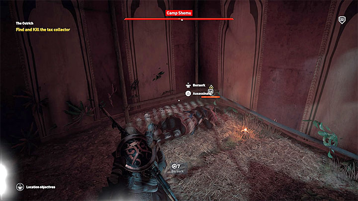 Speak with the woman that is pounding on hut's door. You receive a quest in which you must find and assassinate a tax collector. Go to Camp Shemu, located south-west from the starting point. Scout the area with Senu and find the tax collector. You should also mark all enemies in the camp. Infiltrate the fort at night. Thanks to that you can move easier and kill the sleeping tax collector without problems (the picture). Killing him stealthy during a day may be more difficult. His death ends the quest.