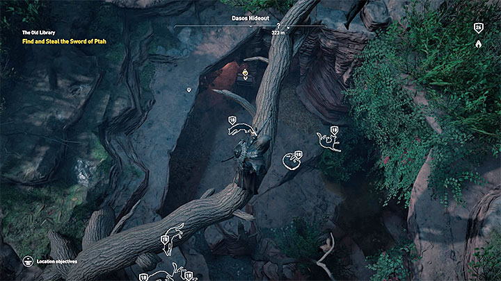 Read the papyrus and head to Nil's east shore - to Ka-Khem Nome province. Your goal is to find a lost sword - reach the ruins adjacent to one of the vantage points in Ka-Khem Nome. There, you will listen to a conversation. Go north to Dasos Hideout. Use Senu to scout the area. You must find the entrance to a cave (it is presented in the picture). A pack of hyenas is near that place. Kill them and go inside. The weapon that you are looking for, Sword of Ptah (level 18, rare), is inside of the big chest.