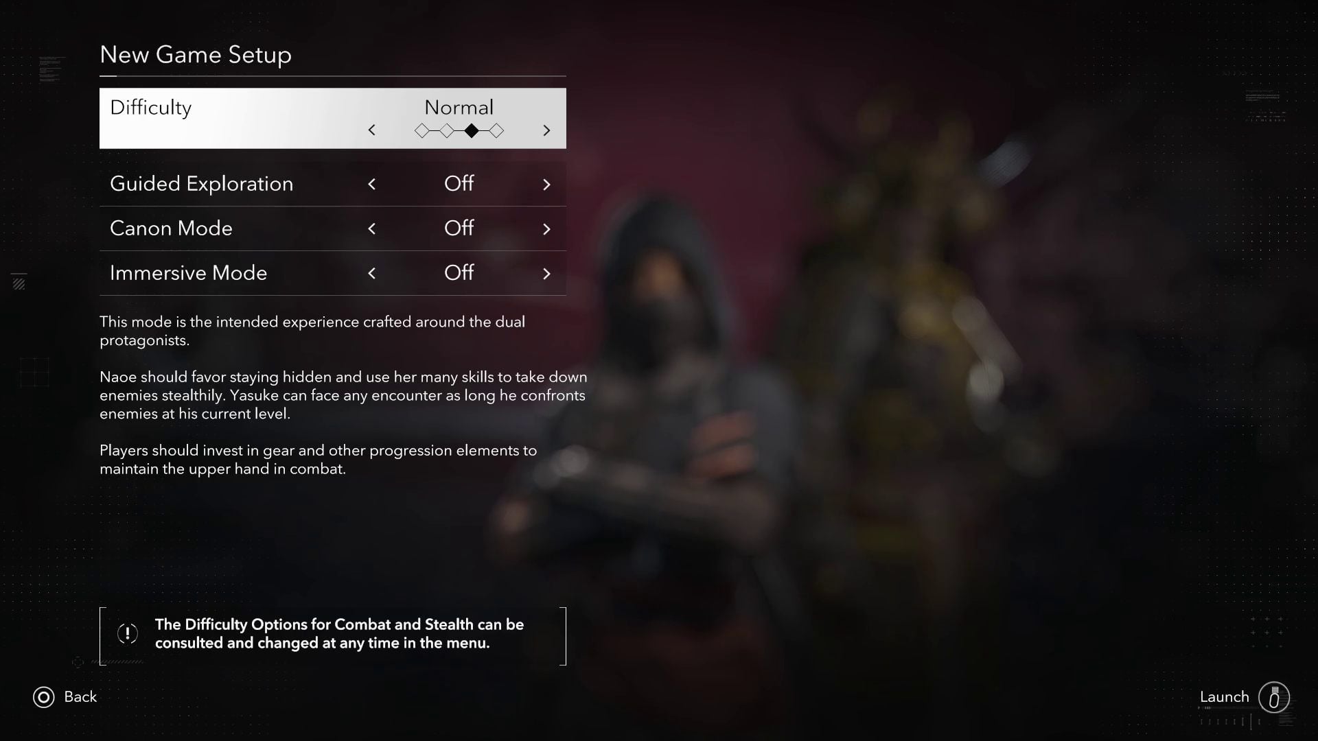 - Forgiving - Naoe is more efficient when in hiding, but she is able to defeat a small group of enemies. Yasuke can handle even larger groups. Enemies are less aggressive than in normal mode.