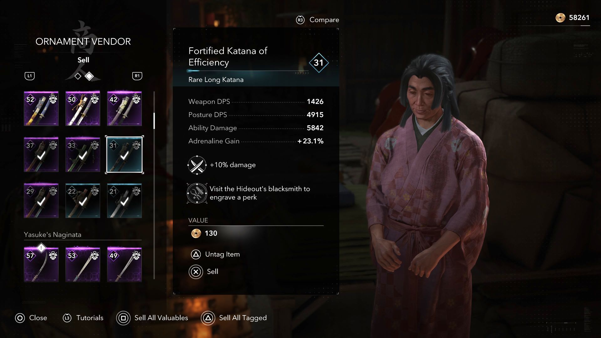 - Upon reaching a merchant and going to the item selling tab, you can mark (tag) individual weapons or clothing items. After highlighting the item for sale, you need to press Triangle/Y on the controller. Then, a selection symbol (V) will appear next to it.