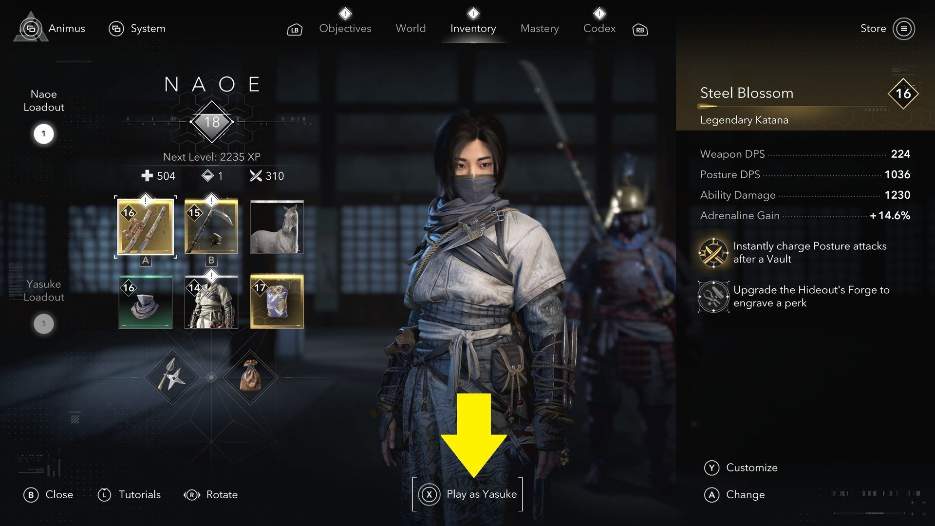 - You will have to choose a character after the cutscenes where Yasuke and Naoe are talking to each other. Once they end, the "Play as Yasuke" and "Play as Naoe" options will appear on the screen, and to continue playing, you must choose one of them.