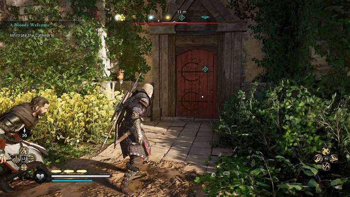 If you want to get inside the cathedral quietly, simply break the red side door together with Basim.