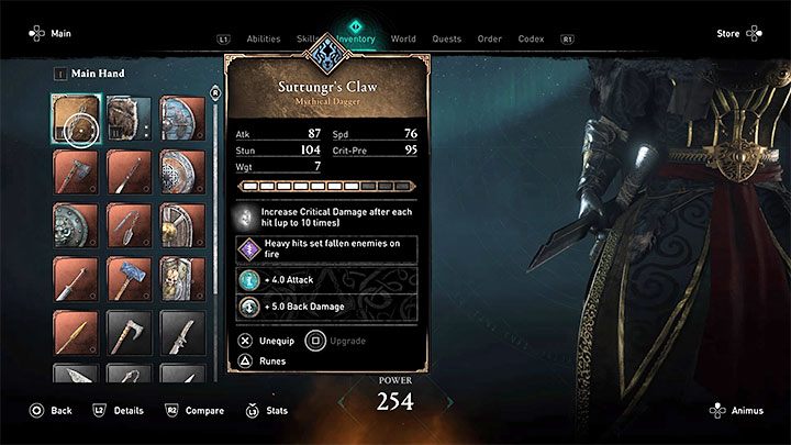 The dagger called Suttungr's Claw is the best choice for the main melee weapon, which is also a reward associated with the exploration of assassin hideouts. The unique feature of the dagger is that it inflicts increasingly more critical damage as more attacks are carried out. The ideal tactic to fight with the dagger is to rely on a series of very quick stabs. There is a good chance that you will be able to land quite a few of them before your opponent manages to defend himself and counter attack.