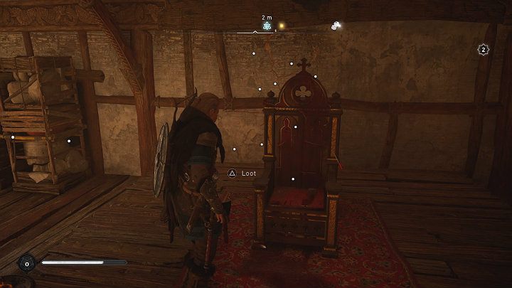In the place marked in the picture above, you will find a long house. Go inside to meet a woman who admires a throne with many arrows stuck in it. The throne belonged to the recently deceased King Edmund.