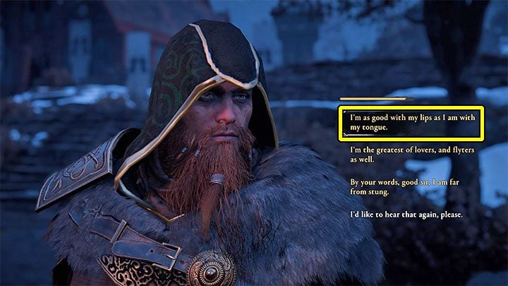 As for the flyting itself, remember to pick the right answers. Start by selecting the third dialog option.
