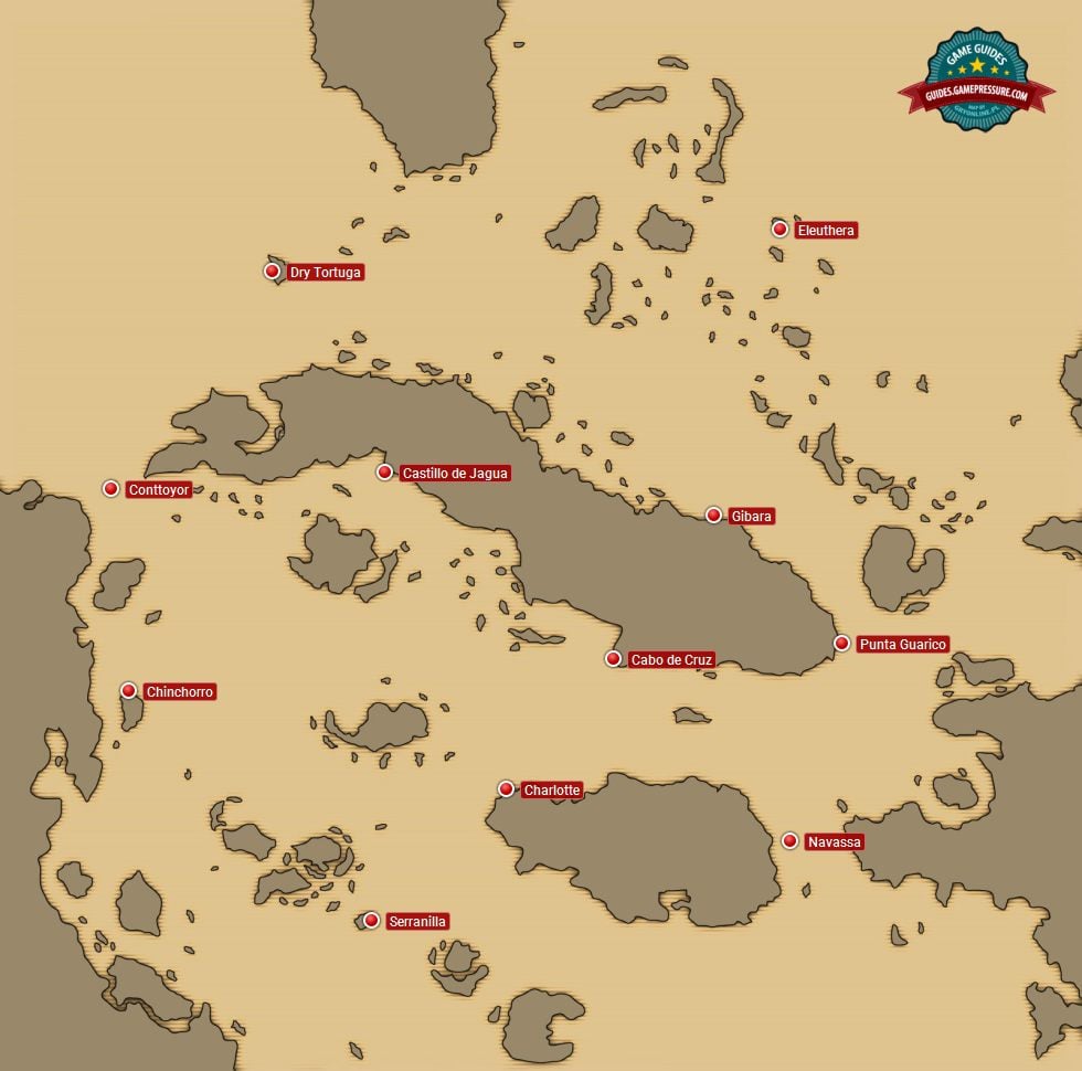 In the Caribbean, there are 11 forts, which have been divided into three categories, depending on their difficulty level. In the upper part of the map, you can find easy forts: Dry Tortuga, Gibra, Eleuthera. In the middle of the map, there are the medium forts: Conttoyor, Castillo de Jagua, Cruz, Punta Guarico, Navassa. The forts of high difficulty level: Charlotte, Serranilla, Chinchorro, are at the bottom of the map. You can attack all of the forts with the moment in which you obtain the Jackdaw, with the exception of Punta Guarico, which will be unlocked in the main campaign mode, in sequence 5, mission 1.