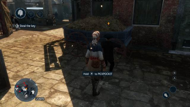 To be able to steal, your notoriety level must be down on zero. Approach the NPC from behind, without being spotted and, while standing behind his back, press the action key. After you have performed this action successfully, proceed on to the next mission objective. You will have to get into the governor's mansion. You can do that in two ways: