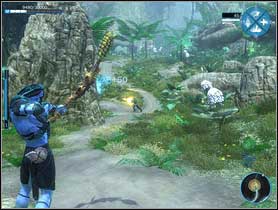 The arena is filled up with RDA units so my advice is to enable a camouflage and quietly steal a valuable item, and then eliminate soldiers. You won't destroy Scorpion so hide behind a rock [1] and wait until the Pandora Union will be available again. Escape to the village, and then to another crystal in the east. First, you need to meet Naalot in the nearby location. He will send you to Obnilvin [2]. The head of the clan will order you to collect 5 grains of cillaphant in a small area. Cillaphants are those illuminating plants. Then, chief will ask you to assemble the lost hunters. You can find them on the southern path (watch out for the gun!) [3]. After saving the clan, you will meet the whole family going to the cave at the east path. Obnilvin will thank you for the rescue and show you the entrance. Go inside. Kill all RDA soldiers and the mecha and take the crystal [4]. Go out on the other side of the cave and meet with Beyda.