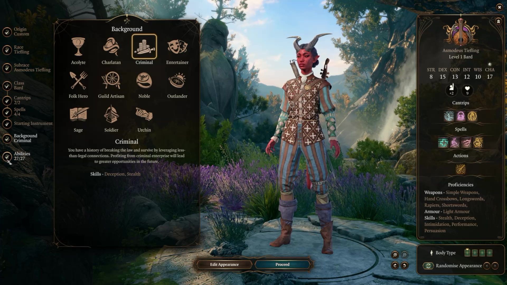 - Criminal - this origin will give you proficiency in Stealth and Deception, which will complement your Bard's abilities.