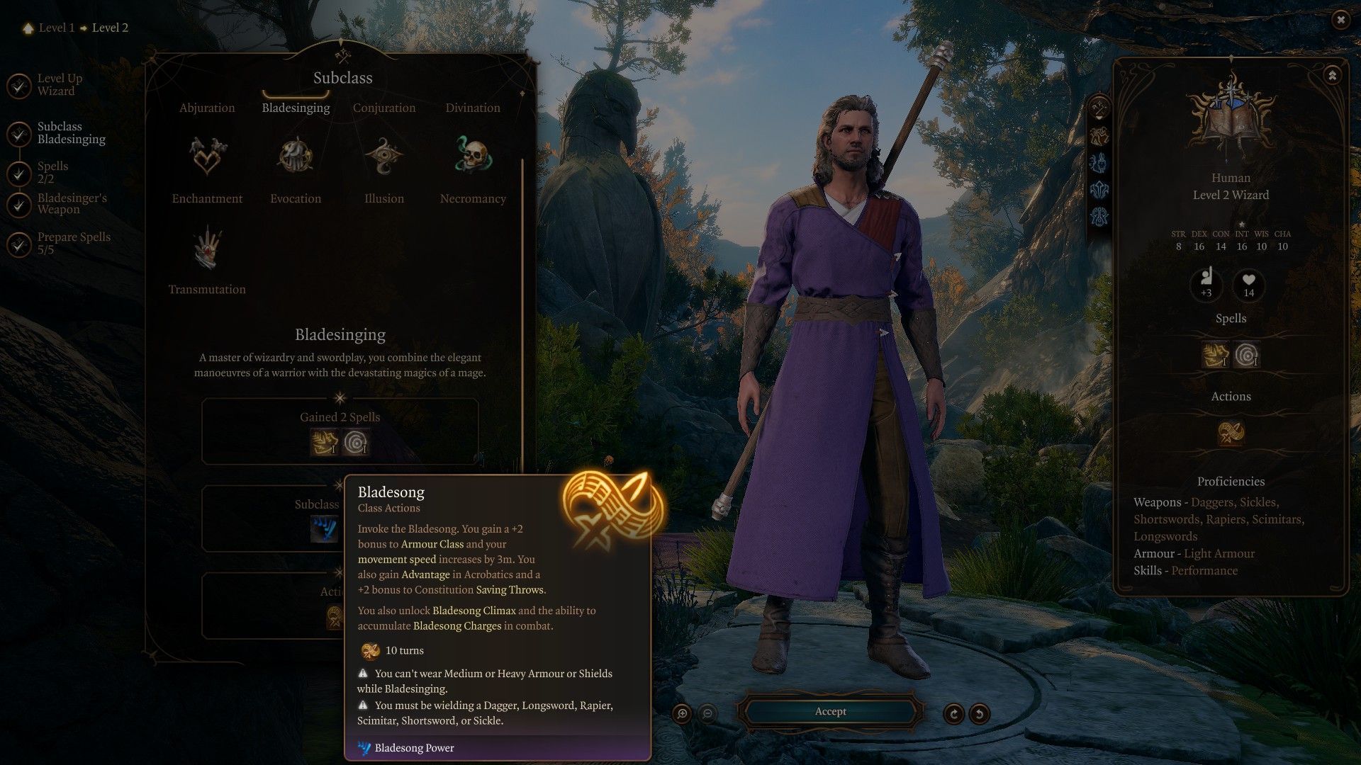 Bladesinging is a new Wizard subclass from Patch 8 of Baldurs Gate 3. This page of the guide provides tips on what style of gameplay the Bladesinging subclass prefers, what special features it has and what to know when creating a Bladesinging build.