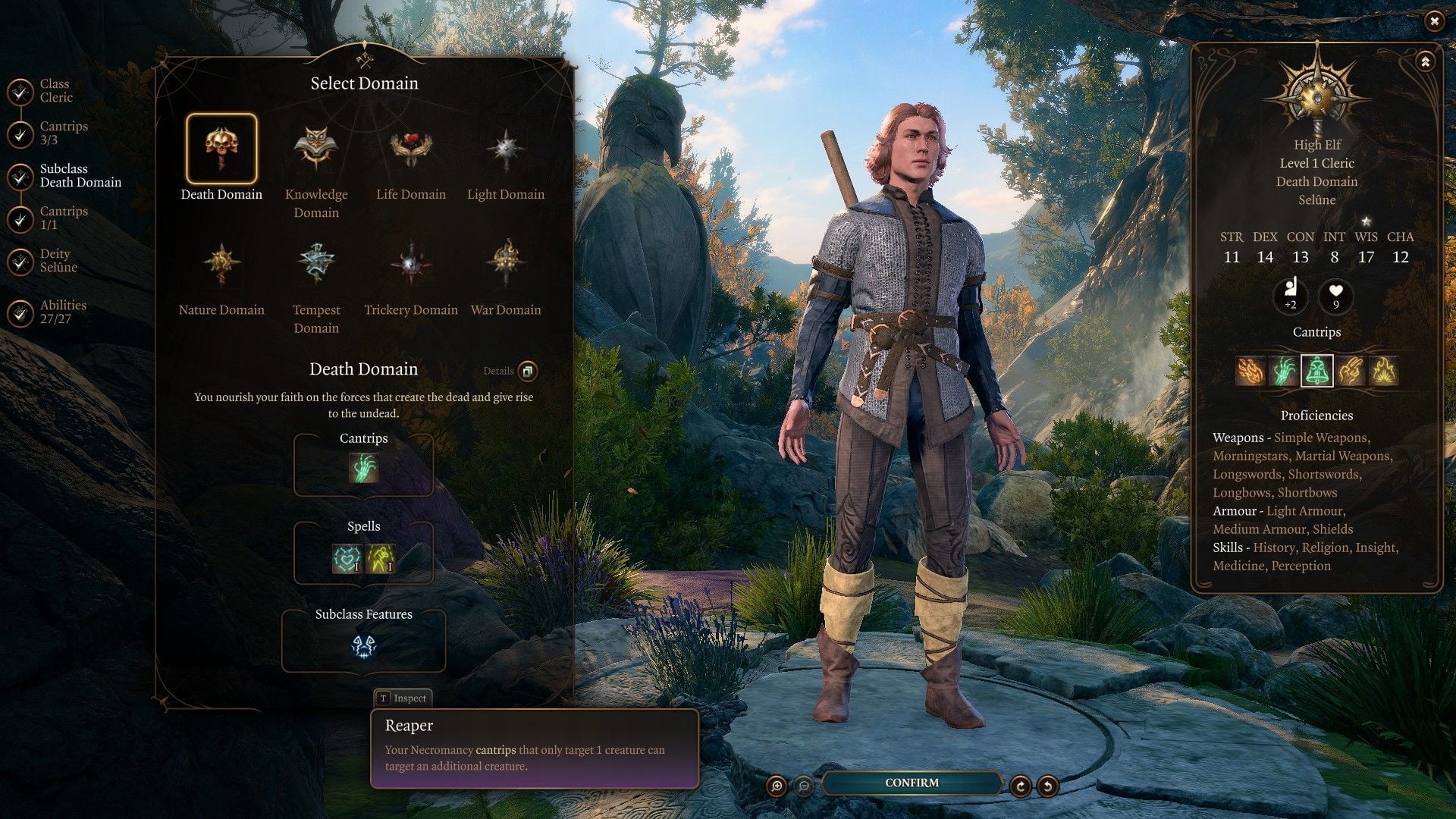 - One of the biggest problems of a Death Cleric is the need to develop many statistics at once. Wisdom (affects spells) and Constitution (affects health and maintaining concentration) are key, but you also have to choose a third stat: Strength or Dexterity.