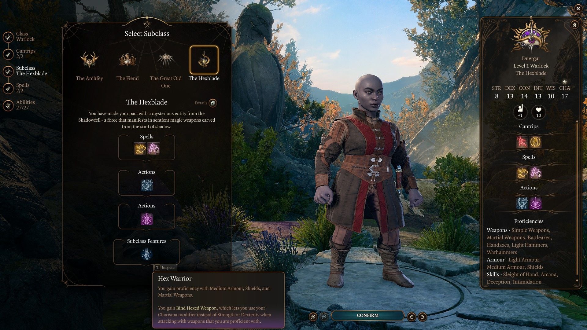 - At level 1, you will receive a lot of bonuses that make Hexblade a very effective subclass for multiclassing. Hex Warrior will give you proficiency in military weapons, shields, and medium armor. Bind Hexed Weapon will allow you to enchant the weapon you hold - from now on, instead of Strength or Dexterity, you will use Charisma for attacks. This weapon cannot be dropped or thrown away, it deals magical damage, you immediately gain proficiency in it, and when attacking enemies with it, you have a chance to inflict a curse on them that increases the damage dealt. You can cast this curse manually, once per short rest.