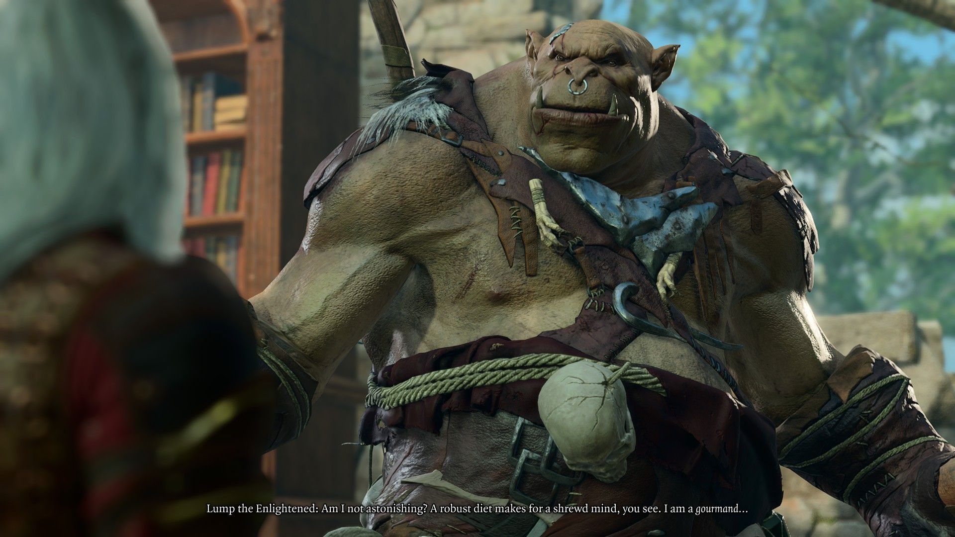 Lump the Enlightened can be found in a ruined house in the Blighted Village, along with two other ogres. Upon approaching him, a conversation will automatically begin - to avoid a fight, you must pass a Deception check (DC 10) or show him the Mark of the Absolute (which you likely don't have - the mark can be obtained in the goblin camp, and to get there, you must pass through the Blighted Village where Lump is located).