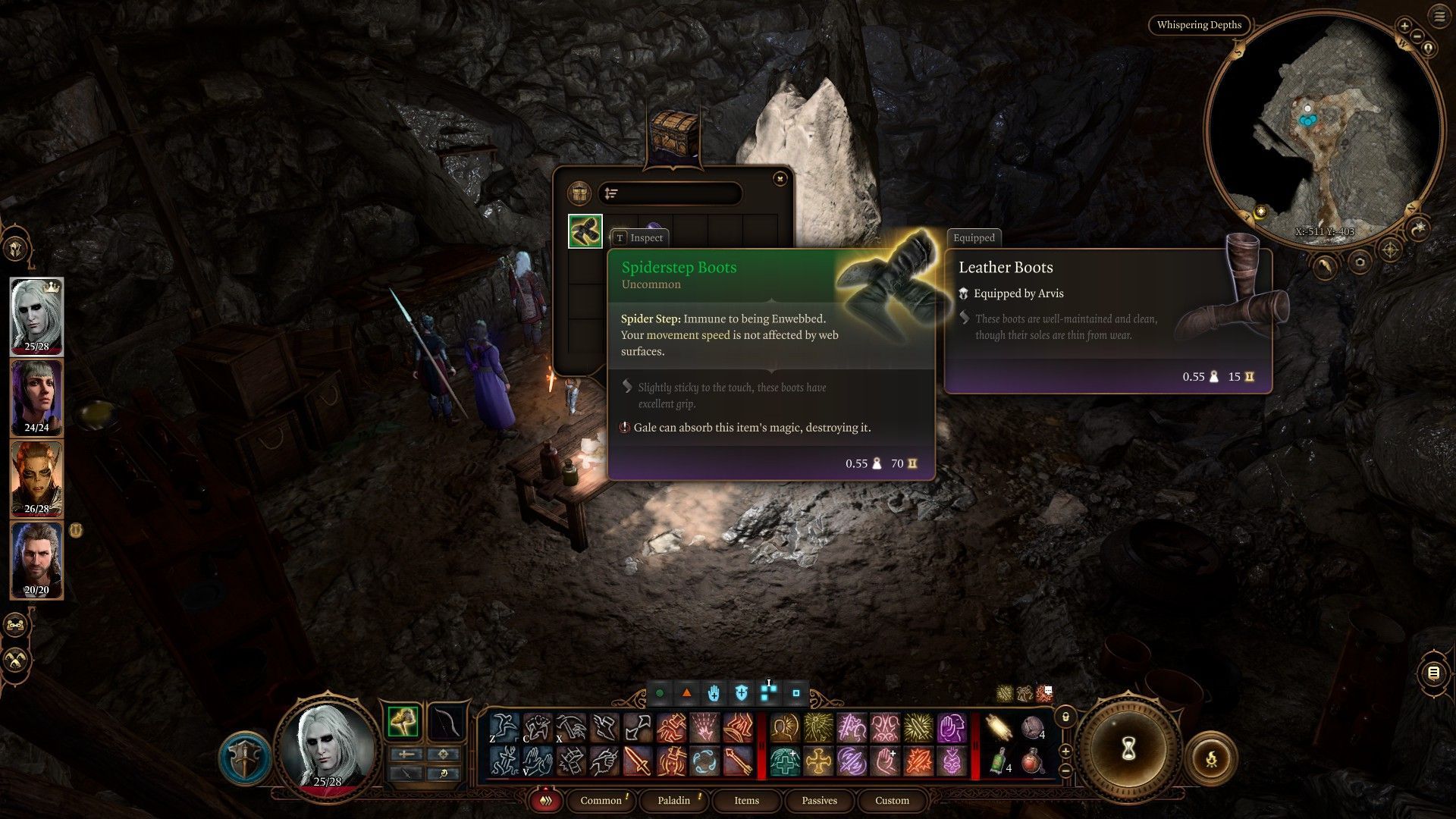 Before heading to the main part of the cave, take the side path leading from the entrance to reach a small workshop. Here, inside a chest, you will find the Spiderstep Boots, which you should equip on your main melee character. The cave is full of webs, and stepping on them inflicts Enwebbed status and immobilizes you. These boots make the hero immune to the Enwebbed status, so they will be very useful here.