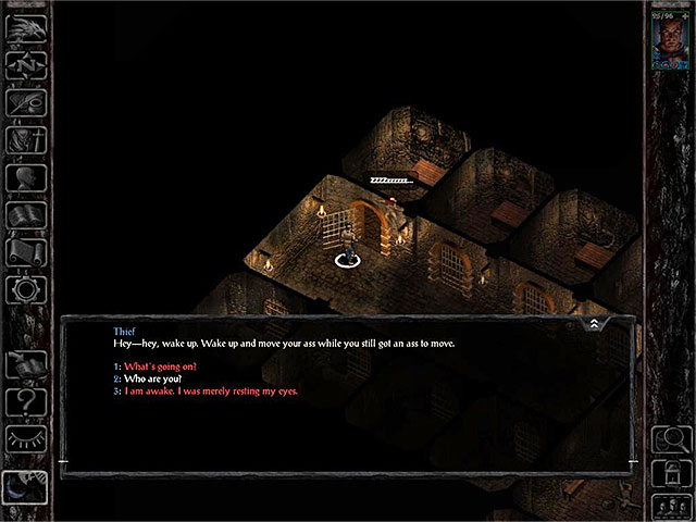 After the main hero goes to rest, a cutscene with Hooded Man and Skie will start. During it the girl will transform into Unknowable Horror and you will have to defeat her. The vision will end and Bence Duncana will accuse the hero of brutally murdering Skie. Further cutscenes will show putting the hero in prison in Flaming Fist Quarter. Once in the prison, you will speak with Corwin whom you can convince that you're innocent. You will also speak to Hooded Man. Soon the cell will be opened by Thief who is friend with Imoen. You will be able to start escaping.