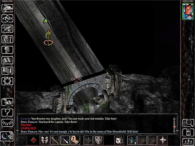 Walk to the main room. If you want, you can interact with the left table in order to reclaim all equipment parts. Use the open hatch to get to the basement and wait for the thief to unlock the secret passage. You will start walking through the sewers. During the journey you will have to deal with weak monsters. Once you reach a larger crossroad with a large hole in the center, select the tunnel leading southeast. After a while you will get close to a waterfall where Bence Duncan and captain Corwin will catch up on you. No matter how you behave you will be attacked. Don't try fighting, you can't win. Instead of that, go towards the waterfall and click it in order to jump.
