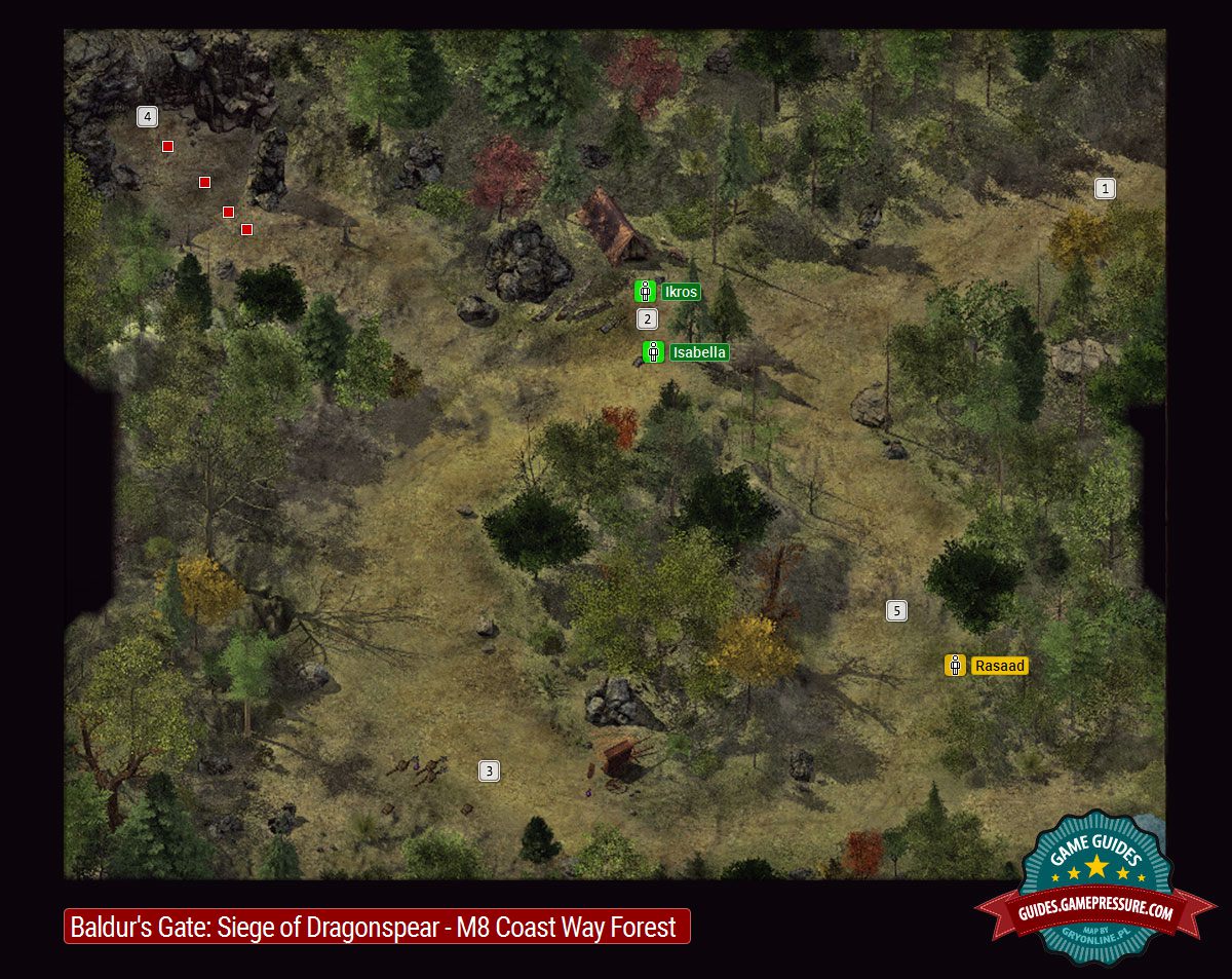The above map shows a small Coast Way Forest, which adjoins the Coast Way Crossing (M7 map). The forest can be reached from the world map, and the location isn't obligatory, as this place doesn't have any tasks connected to the main quest. Nevertheless, the journey to this place is recommended, as you can finish one bigger side-quest, and recruit Rasaad, a monk, to the party.
