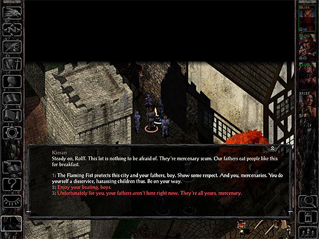 You can unlock this quest by exploring one of the side alleys near the Flaming Fist Headquarters (M6,2). There you will encounter Kieran and Rolff who were captured while breaking the curfew. You can leave them to their fate and let the guards beat them. However, it is better to defend them and convince the guards to leave them alone. Once the guards walk away, speak to Kieran and Rolff again. You can force them to give all their belongings to you (200 pieces of gold) or let them leave. In the latter case you will receive a valuable Waterstar Gem.