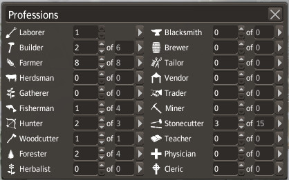 The number next to Laborer is your current amount of laborers - you can assign them to over a dozen professions from the list. The first number next to profession's name is the current number of people in this profession. The second one is the limit of people who can be assigned to it.