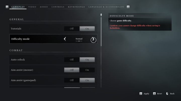 To change the difficulty level, select "Options" from the pause menu. In the "Gameplay" tab, go to the second option from the top, "Difficulty level". Choose the one that interests you, then confirm your choice by saving the new settings. The game will immediately apply the new difficulty level, you don't need to reload a save.