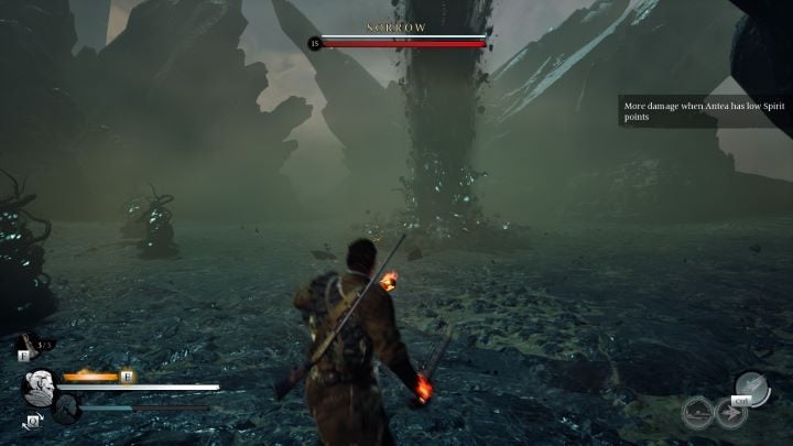 - Comment: The rule forces you to switch characters frequently. Try to deplete Antea's spiritual energy as quickly as possible by attacking enemies or receiving damage in her form. Beware of the green ghosts on the rocks, which can be destroyed with a single shot. During the fight with Sorrow, exhaust your spiritual energy on regular enemies and attack the tentacles as soon as your energy drops.